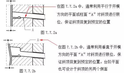 在斜頂機構(gòu)中,為了保證斜頂工作穩(wěn)定、可靠,應(yīng)該注意以下幾點:(A)斜頂?shù)膭傂浴T鰪娦表攧傂砸话悴捎茫?/span>1.在結(jié)構(gòu)允許的情況下,盡量加大斜頂橫斷面尺寸。(參見第七章7.2節(jié))2.在可以滿足側(cè)向出模的情況下,斜頂?shù)男倍冉恰癆”盡量選用較小角度,斜角A一般不大于20°,并且將斜頂?shù)膫?cè)向受力點下移,如增加圖7.7.1a中的鑲塊2,同時鑲塊可以具有較高的硬度,提高 模具 的壽命。(B)斜頂橫向移動空間。如圖7.7.1a所示尺寸“D”,為了保證斜頂在頂出時不與膠件上的其它結(jié)構(gòu)發(fā)生干涉,應(yīng)充分考慮斜頂?shù)膫?cè)向分模距離、斜頂?shù)男倍冉恰癆”,以保證有足夠的橫向移動空間“D”。(C)斜頂在開模方向的復(fù)位。為了保證合模后,斜頂回復(fù)到預(yù)定的位置,一般采用下面的結(jié)構(gòu)形式。如圖7.7.2a;7.7.2b。