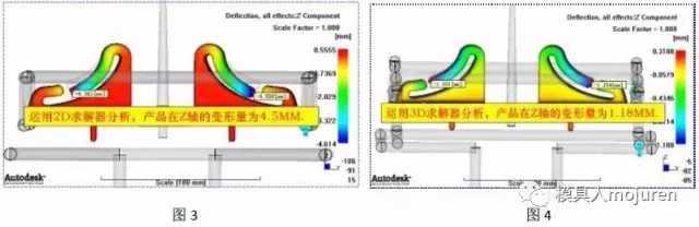 此產品雖有拐角,但不可使用雙層面網格含有拐角效應的選項進行分析,由于此產品的形狀、壁厚分部不均且壁厚變化較大已不符合使用雙層面網格的要求(在這里我用雙層面網格分析了一下,如圖3所示。分析出的變形高達4.5MM),因此采用3D網格分析,分析出來的產品最大變形為1.18MM,如圖4所示。